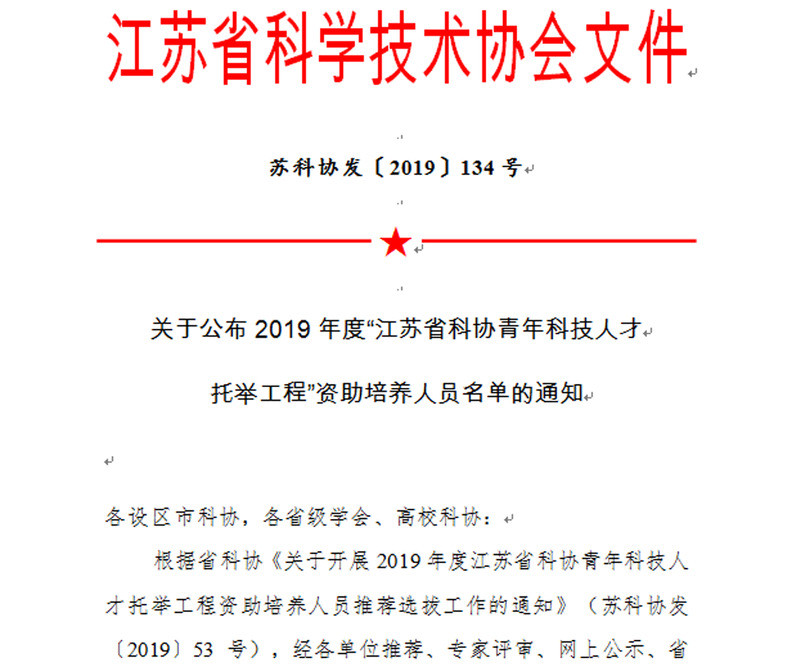 近日,江苏省科学技术协会公布2019年度“江苏省科协青年人才托举工程”资助培养人员名单,公司褚敏捷副教授入选。