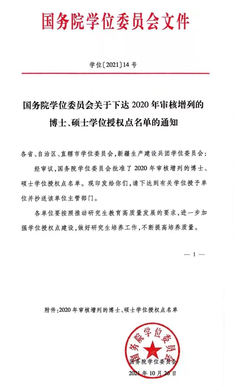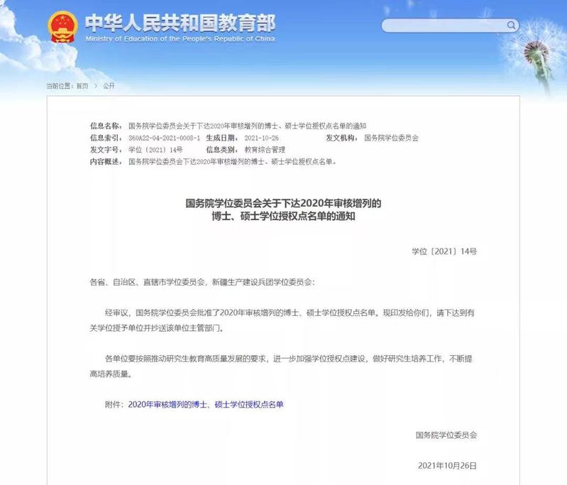 11月11日,江苏省学位委员会发布了《关于下达2020年审核增列的博士硕士学位授予单位及授权点名单的通知》。经国务院学位委员会批准,公司新增公共卫生与预防医学学科博士学位授权点。