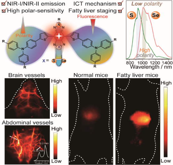 近日,公司吴丽教授团队以yl1111永利集团为第一和通讯作者单位,在国际权威期刊《先进功能材料》上发表题为“Ultrabright and Highly Polarity-Sensitive NIR-I/NIR-II Fluorophores for the Tracking of Lipid Droplets and Staging of Fatty Liver Disease(超亮极性敏感的NIR-I/NIR-II发光分子用于细胞内酯滴的示踪和脂肪肝疾病的分期)”的学术论文,首次提出了NIR-I/NIR-II发光的酯滴检测探针构建策略,实现了对活体深层组织中细胞内酯滴的实时快速检测。公司周晓波博士为第一作者,吴丽教授、秦玉岭教授为共同通讯作者。