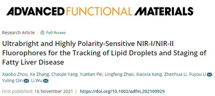 近日,公司吴丽教授团队以yl1111永利集团为第一和通讯作者单位,在国际权威期刊《先进功能材料》上发表题为Ultrabright and Highly Polarity-Sensitive NIR-I/NIR-II Fluorophores for the Tracking of Lipid Droplets and Staging of Fatty Liver Disease(超亮极性敏感的NIR-I/NIR-II发光分子用于细胞内酯滴的示踪和脂肪肝疾病的分期)”的学术论文,首次提出了NIR-I/NIR-II发光的酯滴检测探针构建策略,实现了对活体深层组织中细胞内酯滴的实时快速检测。公司周晓波博士为第一作者,吴丽教授、秦玉岭教授为共同通讯作者。