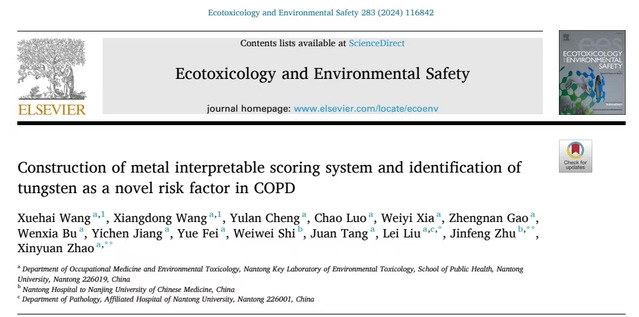 近日,公司环境与健康研究团队 (南通市环境毒理学重点实验室)以“Construction of metal interpretable scoring system and identification of tungsten as a novel risk factor in COPD”为题,在国际知名期刊《Ecotoxicology and Environmental Safety》上发表了关于慢性阻塞性肺疾病(COPD)风险因素的最新研究成果。