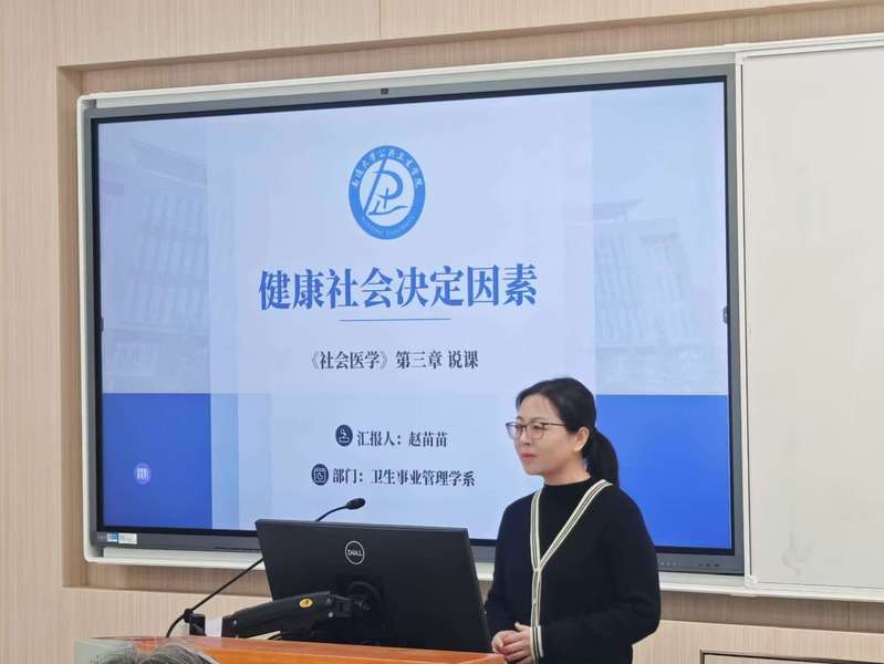 在活动中,赵苗苗副教授说课主题是《社会医学》第三章《健康社会决定因素》,她从教学分析、教学设计、教学过程、板书设计、教学反思进行了现场说课。在教学设计中,她坚持以“员工为主体,教师为主导”的理念,精心构建了课前、课中和课后的教学过程,综合运用案例分析、角色扮演、小组讨论等多种教学方法,从职业情感、家国情怀、科研素养、思辨能力等方面深挖课程思政元素,巧妙地将课程思政元素和前沿学科进展贯穿于教学全过程。
