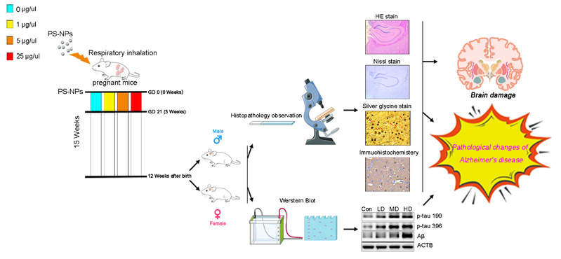 该研究通过建立妊娠小鼠纳米聚苯乙烯(PS-NPs)呼吸道暴露模型,发现妊娠暴露PS-NPs导致成年子代大脑神经元细胞萎缩和丢失,神经纤维缠结和阿尔茨海默症的特征蛋白增加。总的来说,研究表明,孕期暴露于PS-NPs会增加成年后代阿尔茨海默症病变的发生发展。这些发现增强了我们对纳米塑料的跨代毒性的认识,并揭示了阿尔茨海默病的一个新的潜在危险因素。