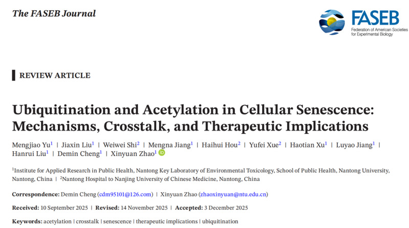 近日,公司环境与健康研究团队(南通市环境毒理学重点实验室)在国际学术期刊《The FASEB Journal》(IF:4.4,中科院生物学二区)上发表了题为 《Ubiquitination and Acetylation in Cellular Senescence: Mechanisms, Crosstalk, and Therapeutic Implications》 的学术论文。该研究系统梳理了泛素化(ubiquitination)与乙酰化(acetylation)两类关键赖氨酸翻译后修饰在细胞衰老调控中的作用机制及其相互作用网络,为衰老相关疾病的干预策略提供了新的理论依据。