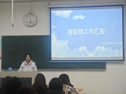 主席曾岚星通过图片回顾了在过去的一学期里,社团举办的各项活动,并简要交代了接下来的工作安排,明确了下一步的工作方向。她强调,要不断提升成员的专业水平,激发参与活动的积极性。活动部长孙艺涵详细总结了活动部在上个学期所做的各类工作,包括活动策划、会员发展、材料整理等。她将与部门成员不断总结反思,把控活动细节,创新活动方式,并加强与各部门的合作。宣传部部长丁中月介绍了上学期发布的9篇推文,展示了部门成员在工作中取得的进步与成果。她表示,在新学期的工作中,她将以“严谨”、“专业”为着重点,提高推文的质量。秘书部副部张筱聆回顾了秘书部所负责的各项工作,涵盖了办公用品、活动道具的采买报销、剧本创作等。秘书部的工作是协会运作的基石,确保了每一场活动的顺利开展。朋辈部部长王兴琴展示了上学期学院成功举办的第二课堂活动,这些都是各班心理委员们履职尽责的成果。她希望在接下来的工作中,能够优化组织形式,加强突发事件处理能力,更加关注同学们的心理状况。艺术团副团长钱添烁回忆了艺术团成员在心理情景剧的创作、表演过程中所付出的点点滴滴,并展望了新学期即将迎来的手语操活动,期待其顺利开展。在部门建设中,她基于各成员的优势,合理分配任务,并及时沟通,促进成员间的相互配合。