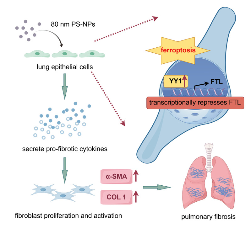 近日,yl1111永利集团环境与健康研究团队(yl1111永利集团为第一作者单位)在国际期刊《Materials Today Bio》(中科院医学大类一区,IF: 10.20)发表题为“Polystyrene nanoplastics-induced lung epithelial cells ferroptosis promotes pulmonary fibrosis via YY1/FTL axis”的学术论文。该研究聚焦环境中广泛存在的聚苯乙烯纳米塑料(polystyrene nanoplastics,PS-NPs),揭示其诱导肺纤维化的重要细胞事件与分子机制。