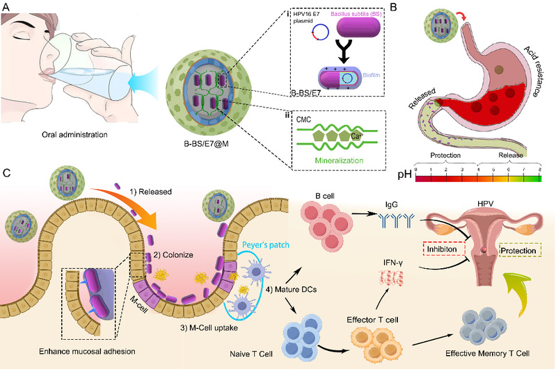 肿瘤疫苗的开发面临两大关键瓶颈:一是如何将抗原安全、有效地递送至免疫系统;二是如何激发强大且持久的免疫应答以同时实现治疗与预防。传统注射疫苗难以有效激活黏膜免疫系统。本研究结合HPV流行病学现状,创新性地将肿瘤抗原递送与肠道这一人体最大的免疫器官相结合,以益生菌枯草芽孢杆菌为载体,对其进行了基因工程改造,使其能够稳定表达HPV16 E7肿瘤抗原;更重要的是,通过矿化工艺,实现以细菌生物被膜包裹的HPV疫苗(B-BS/E7@M)构建。该疫苗能够促进DC细胞分化,精准杀伤肿瘤的细胞;也可促进T淋巴细胞进一步发育成为中央记忆性T细胞,从而在体内建立针对肿瘤的长期免疫监视与保护,实现了“治疗与预防一体”的目标。这项工作为发展新一代“无针化”、可编程的肿瘤免疫疗法开辟了全新路径。