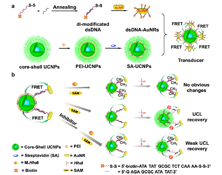 Ultrasensitive DNA methyltransferase activity sensing and inhibitor evaluation with highly photostable upconversion nanoparticle transducer